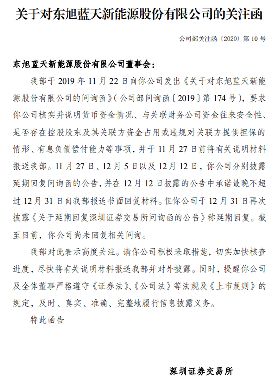 1月15日,深交所向东旭光电、东旭蓝天(4.290,-0.12,-2.72%)下发关注函 ,要求公司积极采取措施,切实加快核查进度,尽快将有关说明材料报送并对外披露。